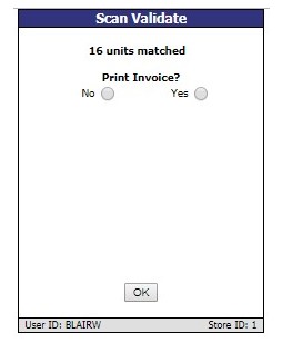 The prompt will also display the text "Print invoice?" with two radio buttons: 'No' and 'Yes'. The value of the switch 'RF SCAN VALIDATION PRINT INVOICE' will determine which radio button is pre-selected and whether the user has a choice to select a radio button value.