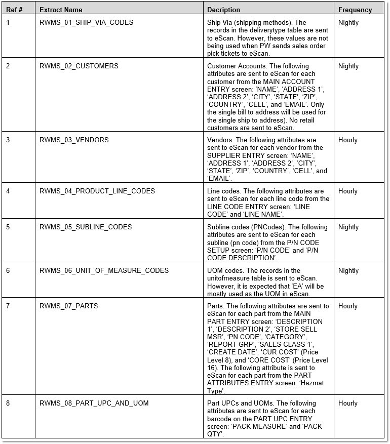 - Communicate the following information when edited in PartsWatch to eScan: Customer Accounts (and shipping methods), Vendors, Products (e.g. Line codes, PNCodes, Parts, UPC codes, UOMs).