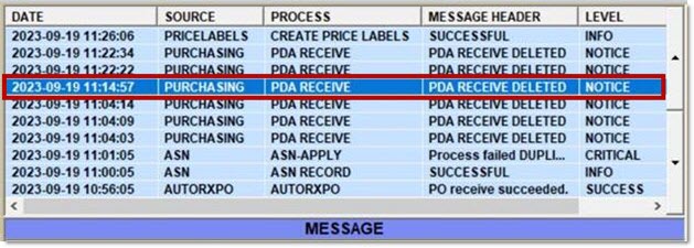 Logs a system message with the 'PROCESS' field as 'PDA RECEIVE'.