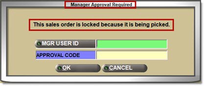 When an attempt is made to bring up a sales order after it has been locked, the application displays the 'Manager Approval Required' pop-up: