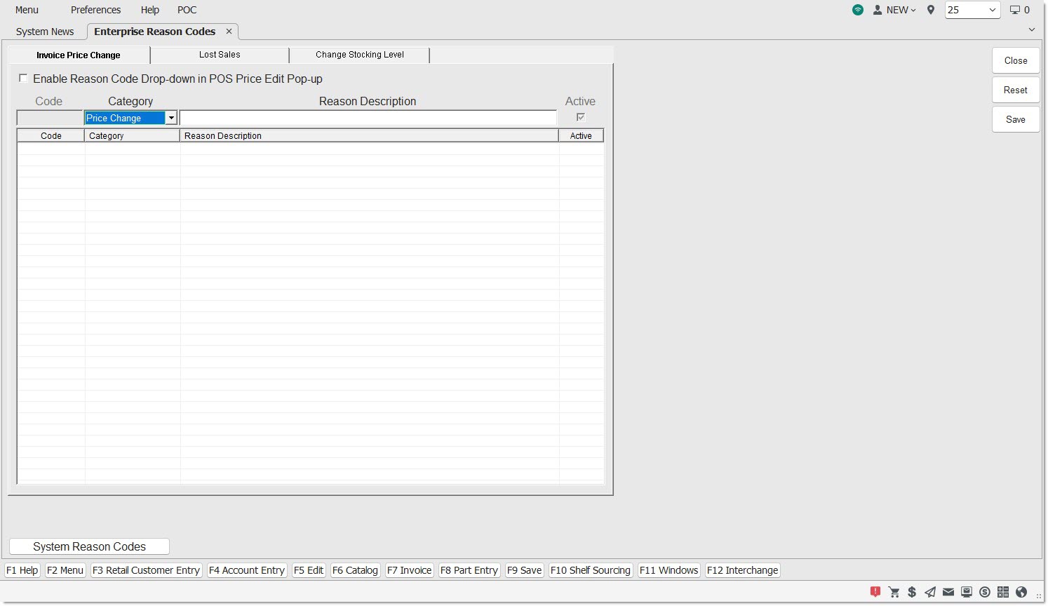 Inactive codes continue to appear on reports for transactions already recorded, but will not display in the 'REASON CODE' field in the 'PRICE EDIT' window at Point-of-Sale.