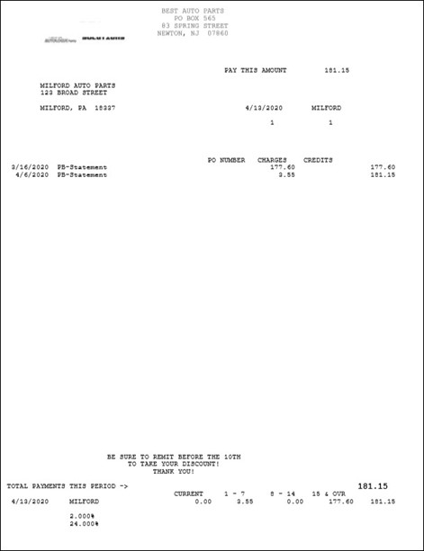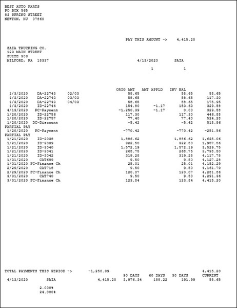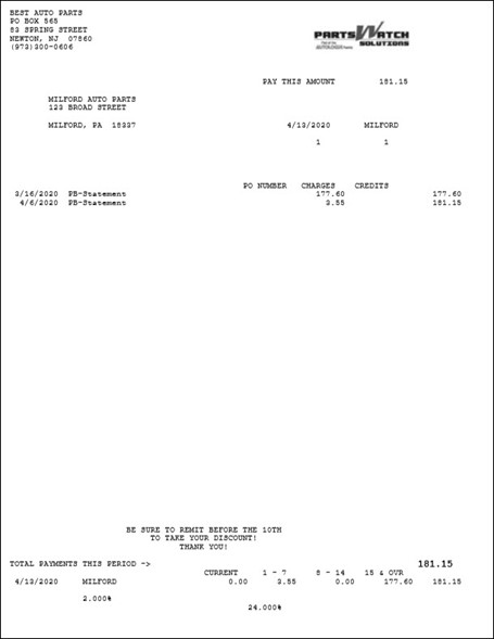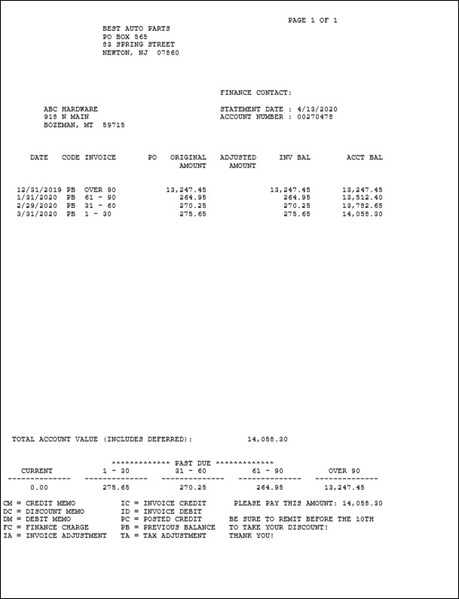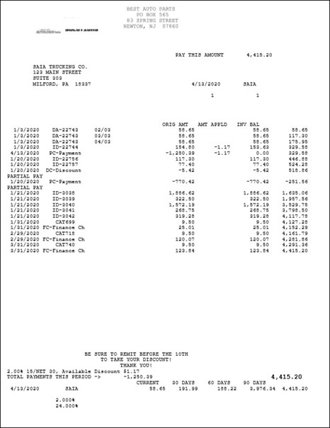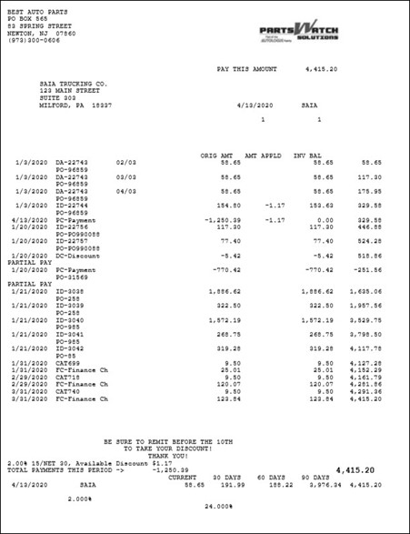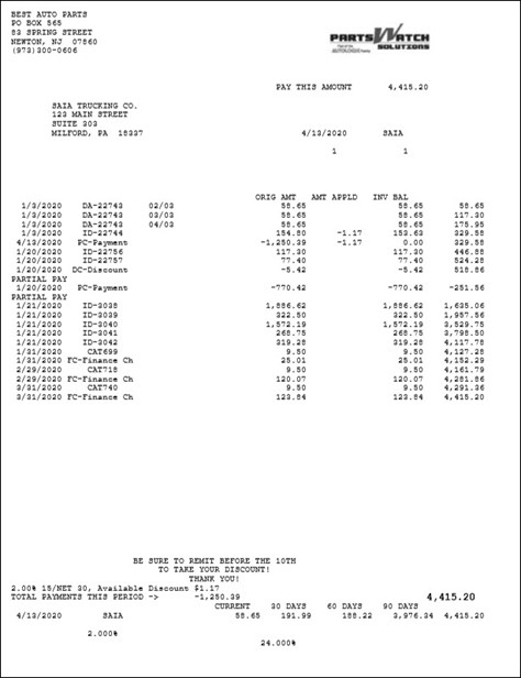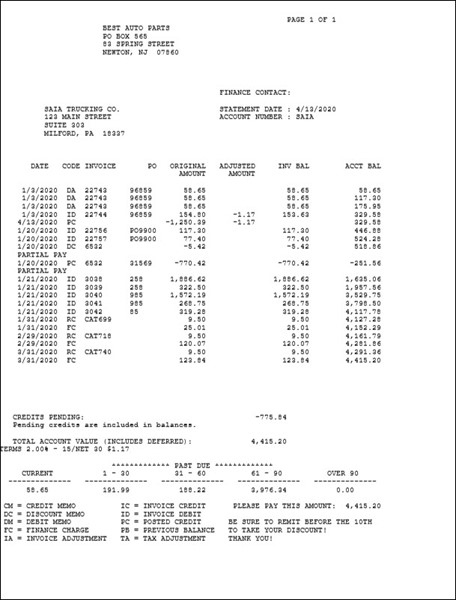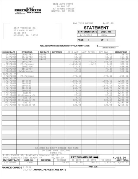 - Unchecked - Does not include tax (including tax on fees), in the prompt payment statement discount, per store. The statement can potentially have the discount terms print with 'Available Discount 0.00' since the credits applied to the current balance may have already paid off the full amount on the non-tax values and only tax values (which don't get a prompt payment discount) are left. For example: