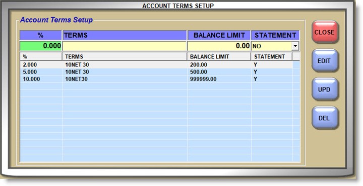 With or without clicking 'EDIT' ('F5'), click the button to open the 'ACCOUNT TERMS SETUP' window used to enter prompt payment statement terms available for selection for all A/R customers. For multi-stores, the terms entered in one store are available for all stores.