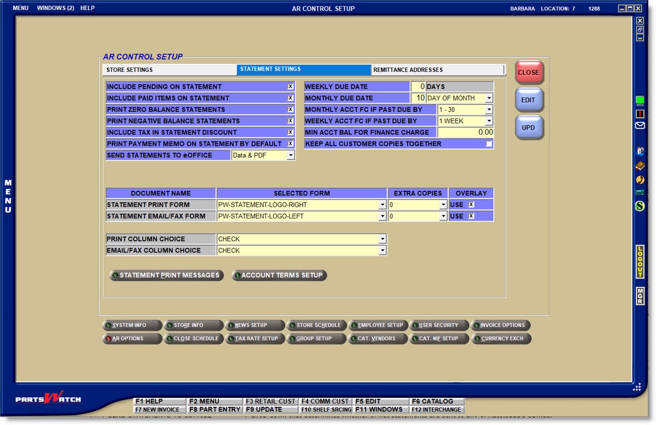 - 'AR Control Setup Screen - 'STATEMENT SETTINGS' Tab