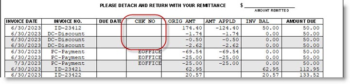 - 'CHECK' - Outputs 'CHK NO' as the column header and outputs the check number entered when an ROA was posted with a payment type of 'CHECK'.
