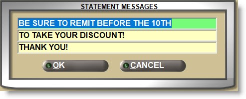 With or without clicking 'EDIT' ('F5'), click the button to open the 'STATEMENT MESSAGES' window to enter up to 3 rows of 32 alphanumeric and special characters each as a message that prints on every statement, depending on the statement form.