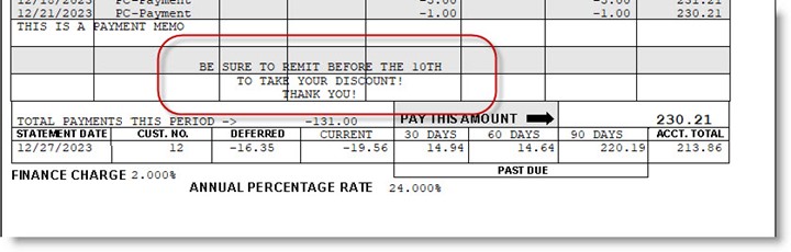 - Checked - Includes tax in the prompt payment statement discount, per store and uses the customer's 'AGE STORE', which can differ from the store printing the statements.