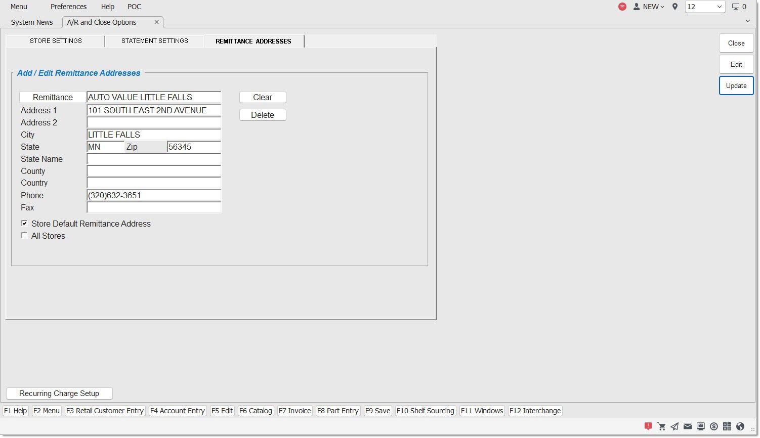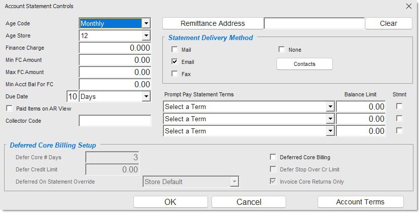 The current store's name and address are used as the statement payment remittance address and the 'STORE DEFAULT REMITTANCE ADDRESS' field is checked by default; therefore, If statements are printed from the current store and payment is remitted to that store, no further setup is needed.