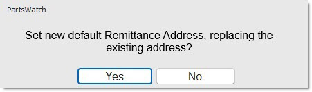 - Click the 'STORE DEFAULT REMITTANCE ADDRESS' field to save the change for the store. When the field is checked, the system prompts to make sure the address should be changed. Answer 'YES' to use the address for statement printing. Answer 'NO' and the process is aborted.