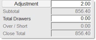 - 'FORCE OVER/SHORT' - If the cash entered does not equal the cash tracked by the system so that an 'OVER / SHORT' displays, when the 'CLOSE/PRINT EOD' button is clicked, a prompt opens stating that an adjustment should be made before closing. Unless the 'TOTAL DRAWERs' equals the 'SUBTOTAL', the close cannot continue.