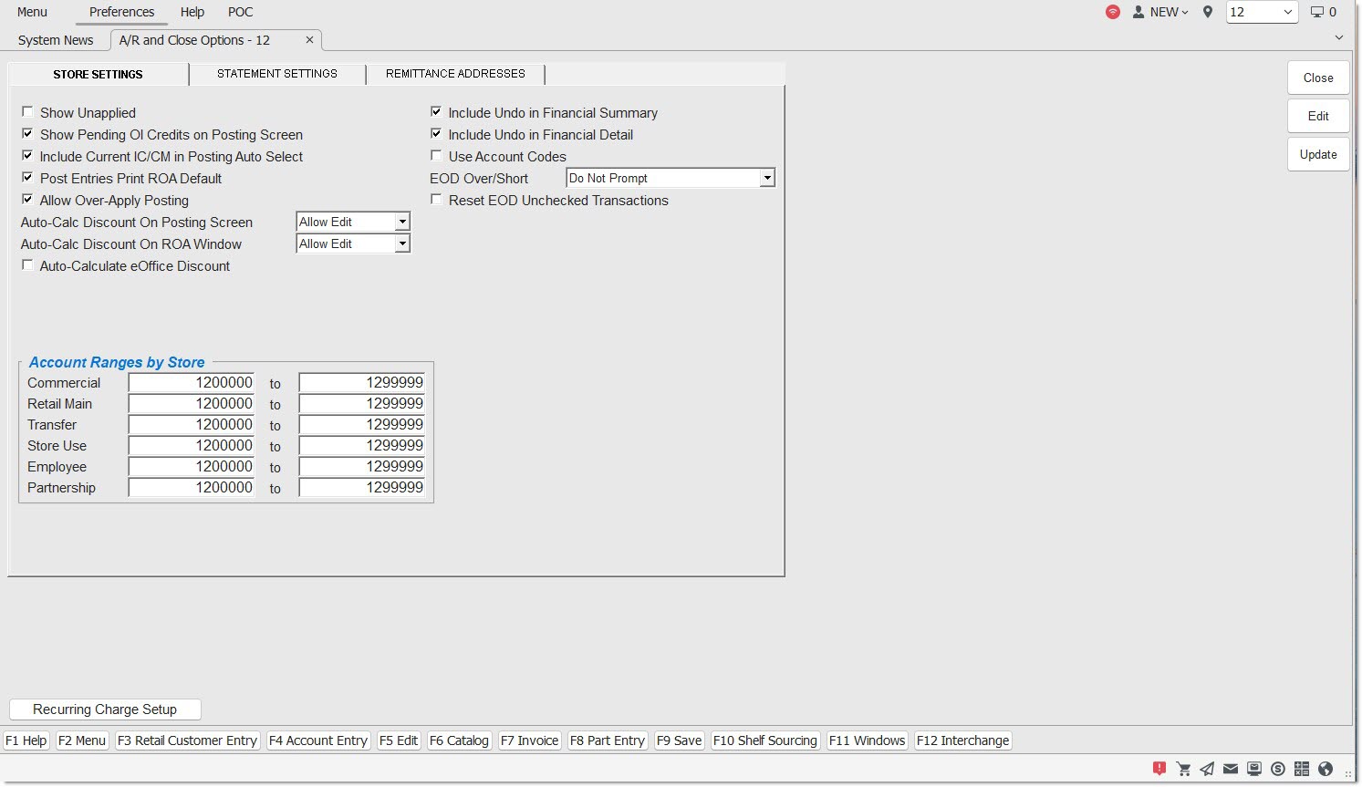 - 'A/R and Close Options Screen - 'STORE SETTINGS' Tab