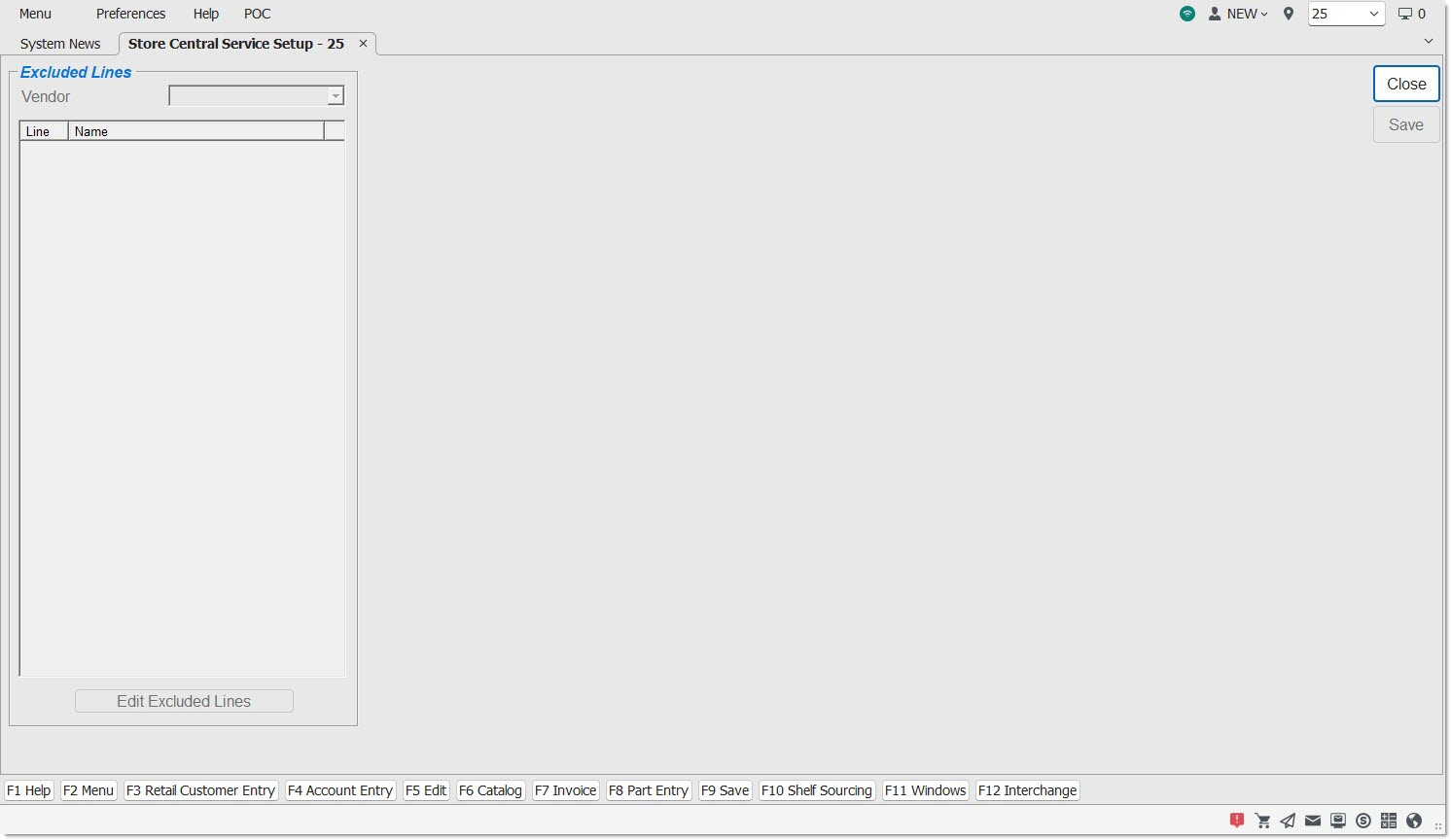 The STORE CENTRAL SERVICE SETUP screen is used to enable users for all Central Services to maintain a list of lines excluded from having their part prices and costs updated from the Central Service "part pricing" file.