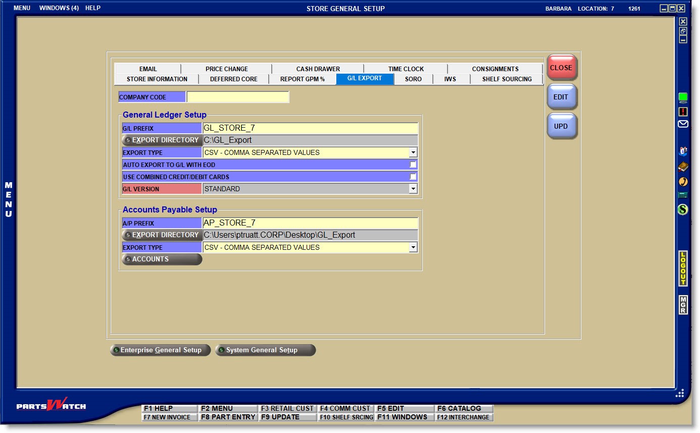 Menu Path: Controls, Store, General Setup, STORE GENERAL SETUP screen, 'G/L EXPORT' tab
