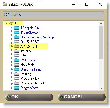Click the button and a window opens to select the directory the A/P file will be exported to. The field displays the selected directory and cannot be edited.