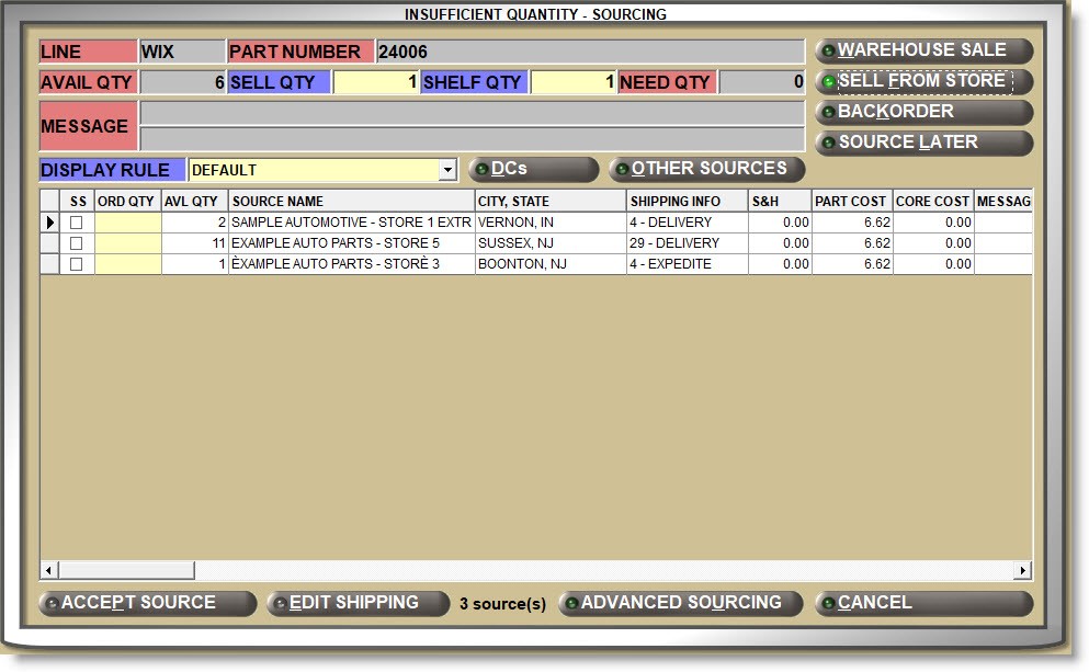 If the store's QOH is greater than zero, the 'INSUFFICIENT QUANTITY - SOURCING' window opens with 'WAREHOUSE SALE' and 'SELL FROM STORE' buttons to determine where to sell the part.