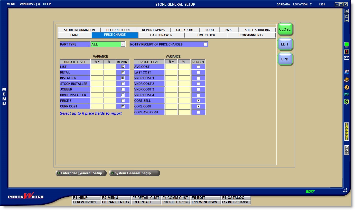 Click the 'PRICE CHANGE' tab at the top of the STORE GENERAL SETUP screen to display a page with Price Change Reports setups. The 'PRICE CHANGE REPORTS' are used to view part price changes that are received and applied by the inventory feed.