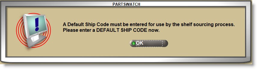 If a 'DEFAULT SHIP CODE' is not selected before the 'UPD' button is clicked, a prompt opens notifying that one must be selected.