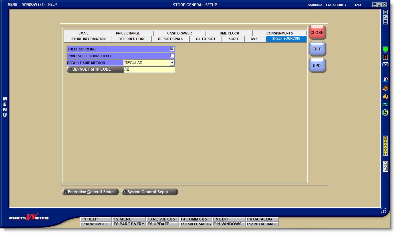 Click the 'SHELF SOURCING' tab at the top of the STORE GENERAL SETUP screen to display a page with Shelf Sourcing setups.