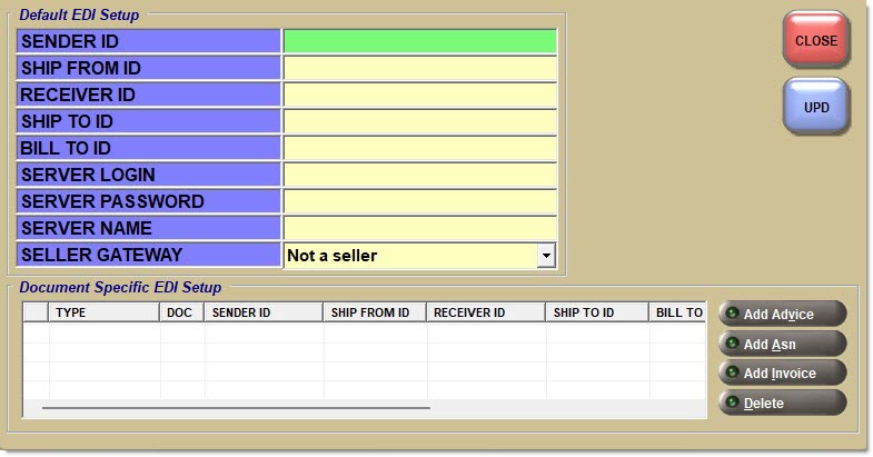 Store-level configuration is looked at first, and then customer level configuration, which are configured in the 'EDI Setup' section of the 'INVOICE & DELIVERY SETUP' window. Customer-level configurations override any store-level settings configured in the STORE INVOICE OPTIONS screen, 'EDI SETUP' tab. For example, if only the 'SHIP FROM ID' and 'SHIP TO ID' values are set for the customer ('INVOICE & DELIVERY SETUP' window), the system retrieves all of the other values from the STORE INVOICE OPTIONS screen to deliver the EDI 810 Invoice. Another example, if the 'SERVER LOGIN', 'SERVER PASSWD', and 'SERVER NAME' is configured at the store-level only and left blank at the customer-level, all invoices (both store and customer) are sent to the server identified on the store-level.