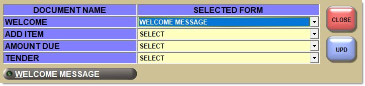 Displays the welcome message that displays when the application starts up or in between sales orders. Select the welcome message form from the drop-down.