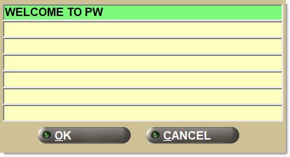 Displays the 'WELCOME MESSAGE' pop-up used to enter up to seven rows of text that is used by the form selected in the 'WELCOME' field. The welcome message displays on the Pole Display between invoices.
