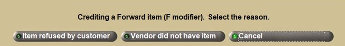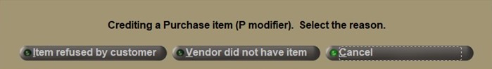 Choose either 'Item refused by customer' or 'Vendor did not have item' to continue accepting the return, or 'Cancel' to cancel to return.