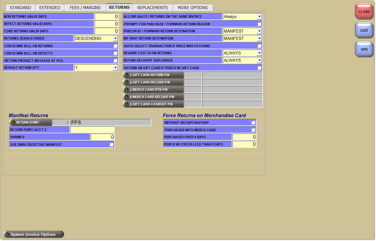 Menu Path: Controls, Store, Invoice Options, STORE INVOICE OPTIONS screen, 'RETURNS' tab