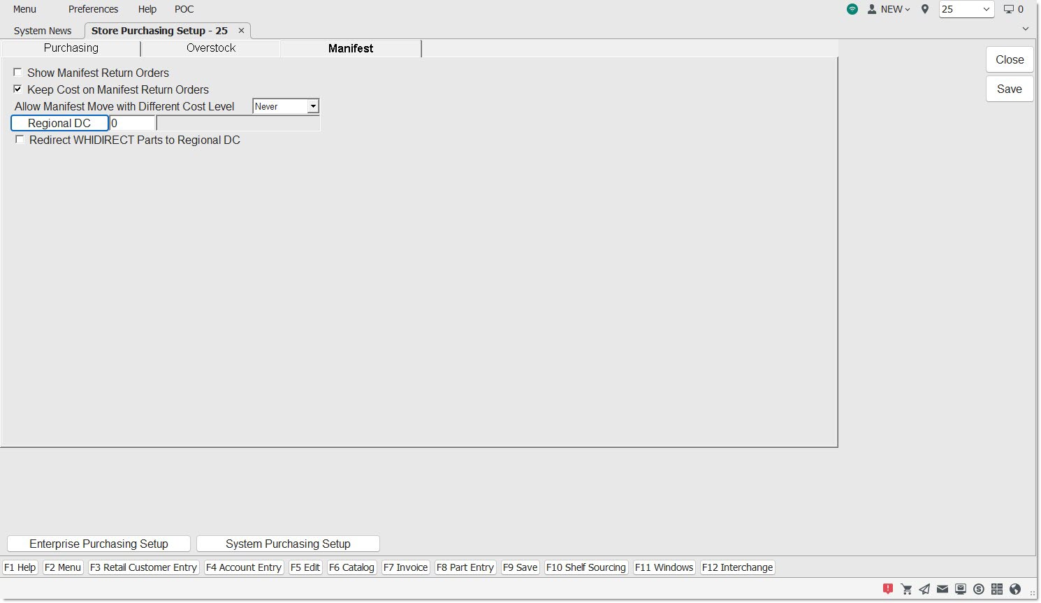 Store Purchasing Setup Screen - 'Manifest' Tab
