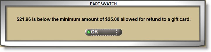 At Tender, when a value to be returned to a gift card is less than the 'MINIMUM REFUND AMOUNT', the system will deny the transaction. Select another tender type to complete the transaction.