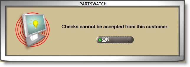 - Checked - The 'CHECK' icon is available on the 'Invoice Tender' and 'ROA Tender' windows if the customer's 'ACCEPT CHECKS' field is checked. If the 'CHECK' icon is enabled and the customer is not allowed to pay by check, clicking the 'CHECK' icon prompts that checks cannot be accepted