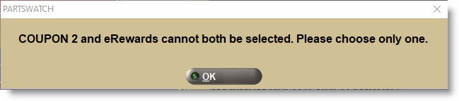 If both 'COUPON 2' and 'eRewards' are selected, when the 'UPD' button is clicked a prompt will open stating to choose only one.