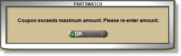 If the 'AMOUNT' entered for the coupon is over the 'MAX COUPON AMOUNT', a prompt opens to re-enter the coupon amount.