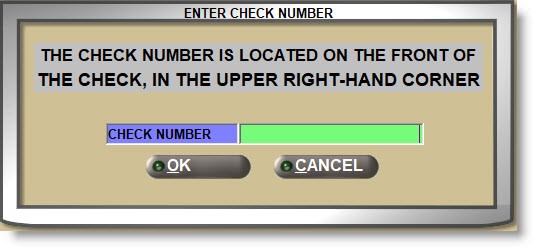 Since a check number must be entered, if the 'OK' button is clicked without entering a check number, a warning prompt opens, and when closed, the 'ENTER CHECK NUMBER' pop-up remains open.