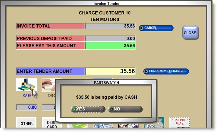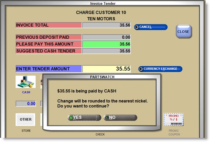 The system prompts that the amount being paid will be rounded to the nearest nickel. In the following example, the 'PLEASE PAY THIS AMOUNT' is $35.56; however, the 'SUGGESTED TENDER AMOUNT' displays the rounded amount of $35.55.