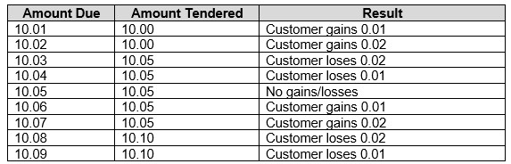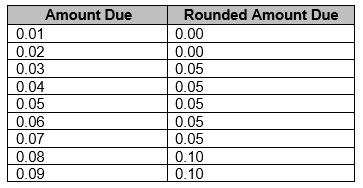 - '.05' - Pennies are not accepted as tender, therefore, the system rounds the amount to the nearest nickel (5 cents, 0.05 dollars)