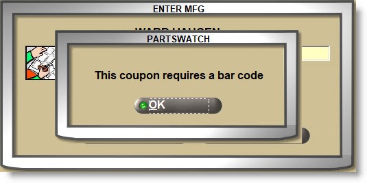 - Unchecked - When the 'COUPON 1' icon is enabled and available on the 'Invoice Tender' or 'ROA Tender' windows, if clicked, a pop-up opens to optionally scan or enter a 'BAR CODE'.