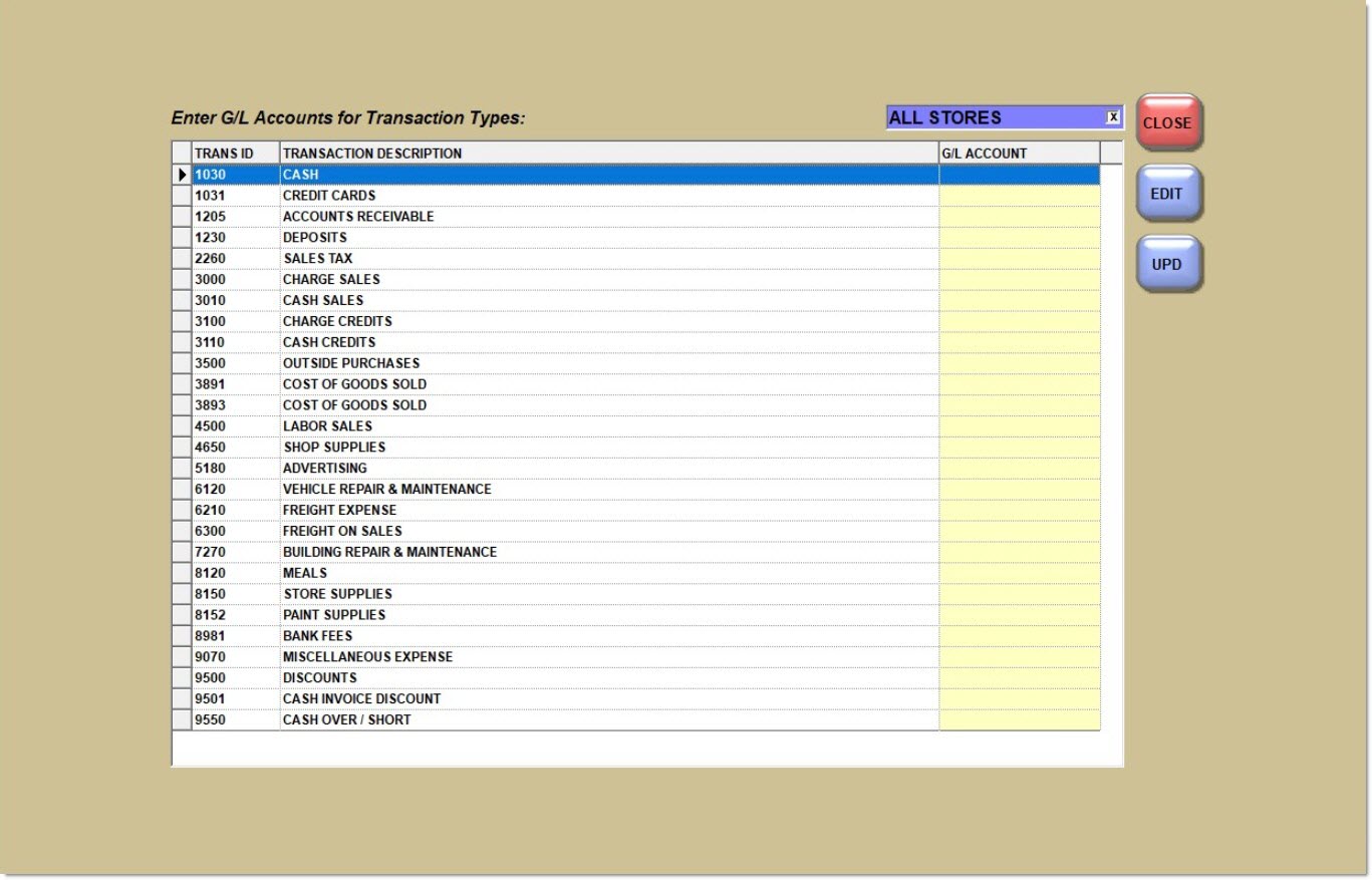 The G/L Account Code Setup screen is used to "link" the PartsWatch total fields included in the General Ledger (G/L) Export to the unique General Ledger account numbers from the accounting package.