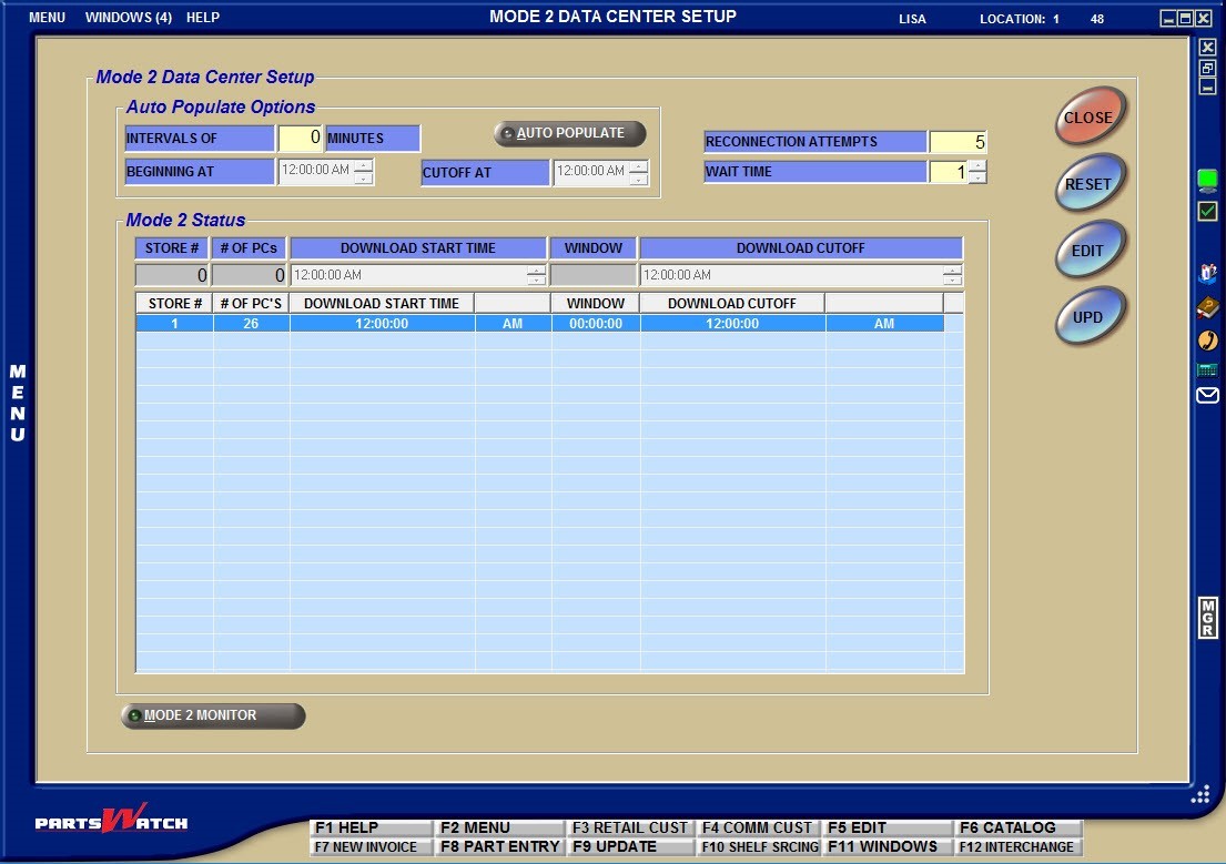 - PartsWatch checks for connections to the database based on the Re-connection Attempts and Wait Time set up in the MODE 2 DATA CENTER SETUP screen.
