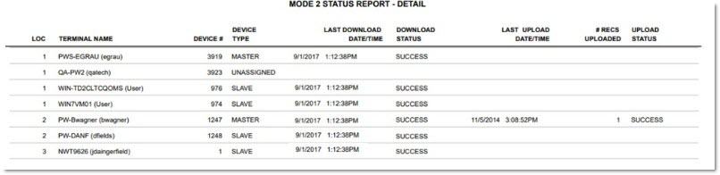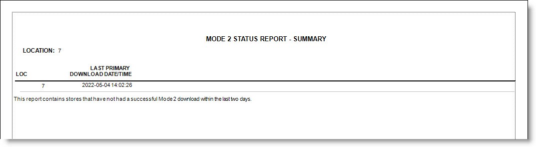 The Mode 2 Status Detail Report is used to view the download and upload status of each PC setup for Mode 2. The Mode 2 Status Summary Report can be used for a quick view of the Mode 2 status for each store.