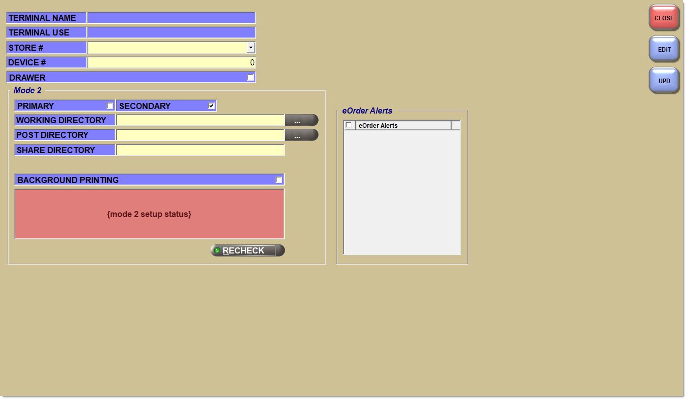 Typically, one PC in the store is designated as a Primary and all other PCs in the store are designated as Secondary terminals. The Primary’s role is to pull the latest data from the data center each night at a designated time and store it in a local file to share with all other POS terminals in the Primary/Secondary work group.