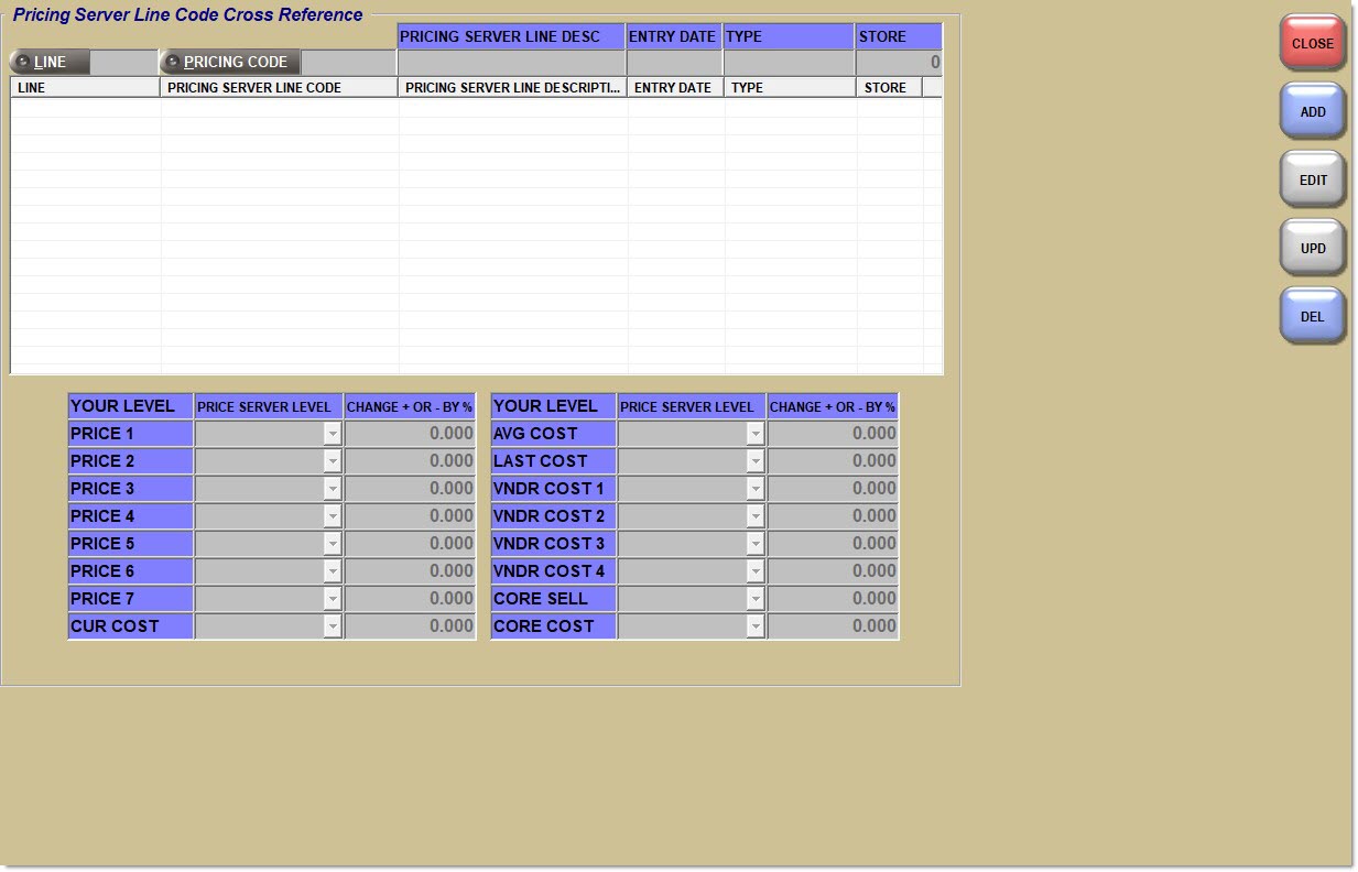Click on a row in the upper grid to select the 'Line Code' to be edited. The cross-reference record displays above the upper grid and the upper grid is unavailable. Note: Only the 'Price Server Level' types and the 'Change + Or - By %' fields in the lower grid are editable.