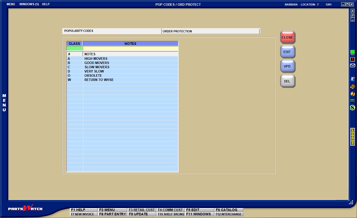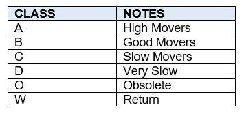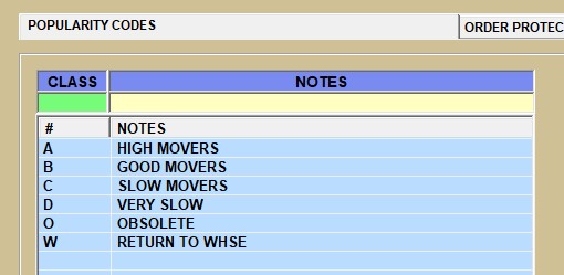 Since 'SALES CLASS' codes are used by the Line Codes throughout the Inventory, Purchasing and Reporting modules, Popularity Codes should be meaningful and optionally set up simply, for example, as A through D or 1 through 4 in order to group the best movers as A or 1 and the slowest movers as D or 4.