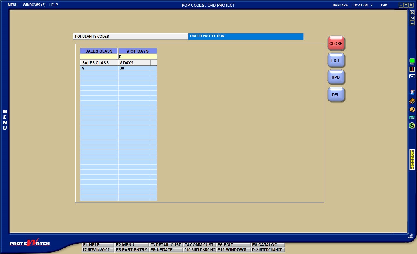 Enter from ‘1 to ‘99’ as the '# OF DAYS' for each 'SALES CLASS' code entered. If the '# OF DAYS' is left at ‘0’, then order protection does not delay including the part on an order even if the part was just sold.
