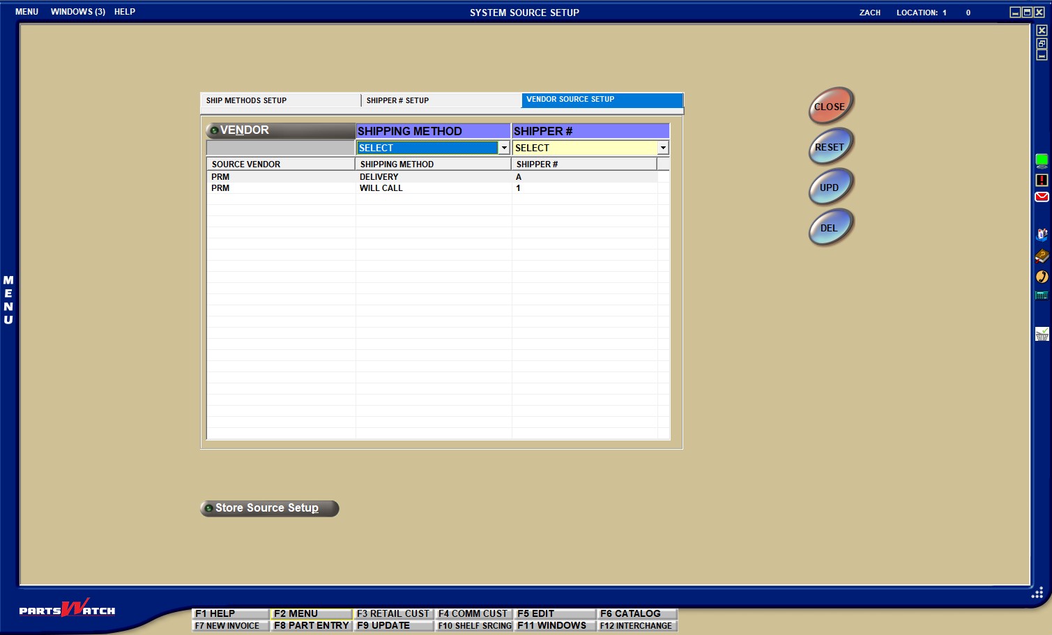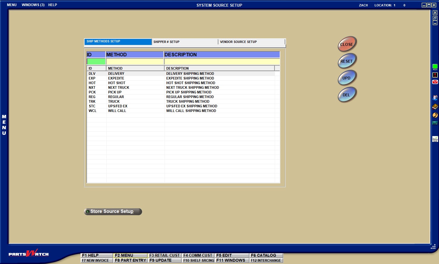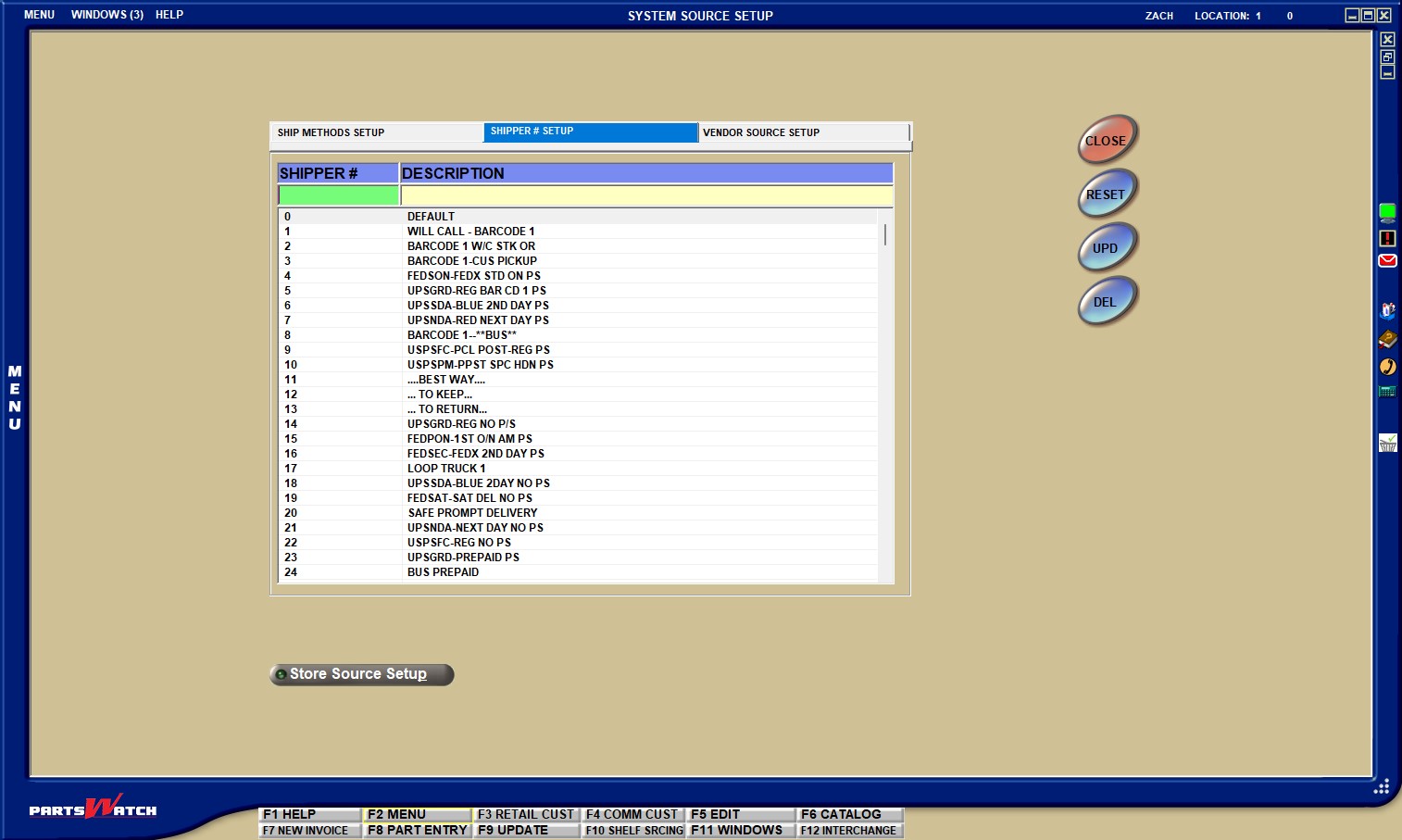 The System Source Setup screen is where Ship Methods and Shipper #s can be set up, as well as a Vendor Source Setup table that allows Ship Method/Shipper # relationships to be set up for each vendor.