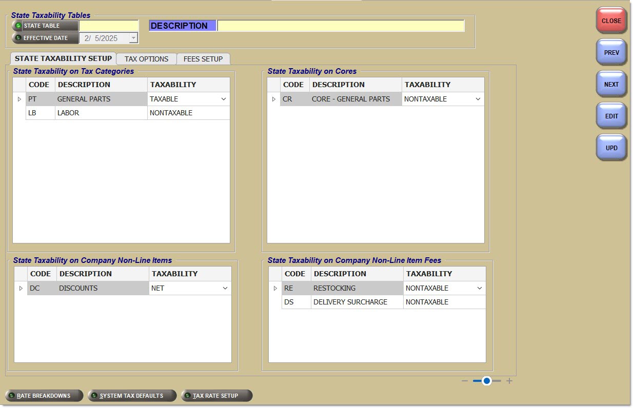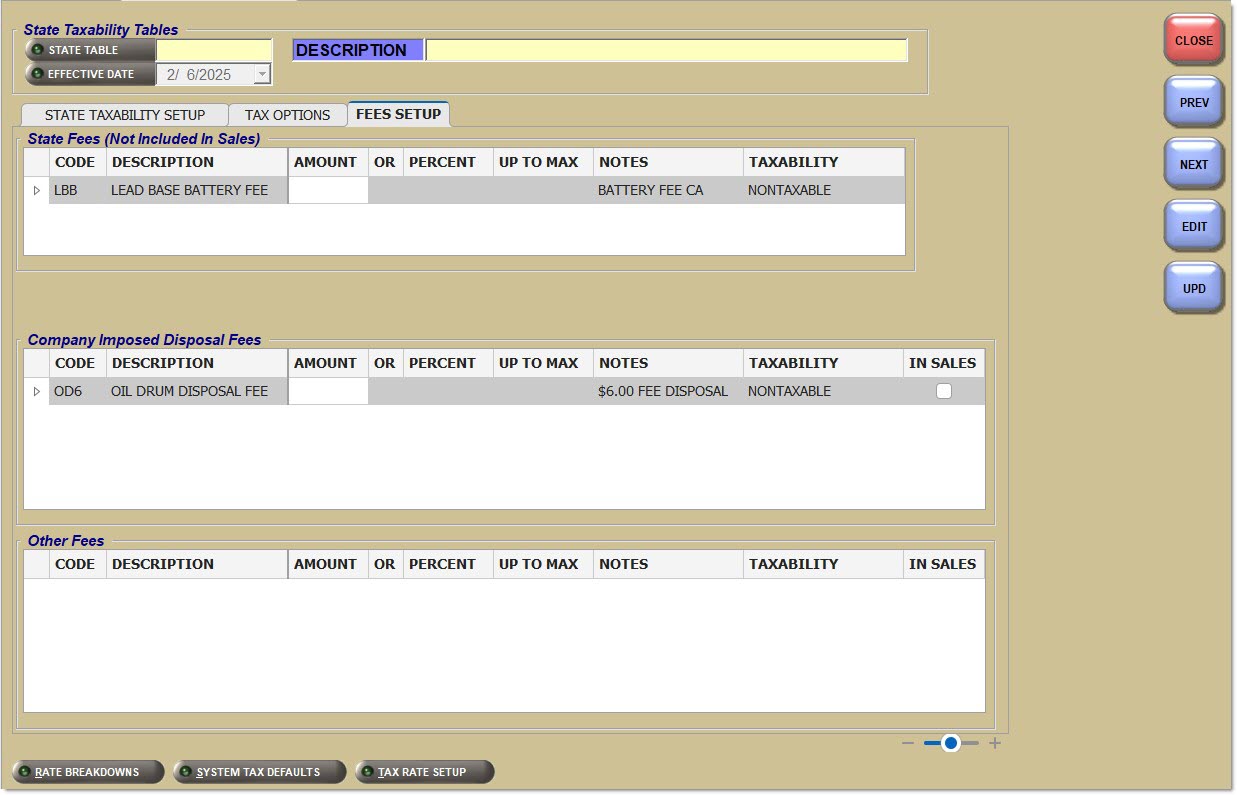 Used to set up State Fees (Not Included In Sales), Disposal Fees, and Other Fees rates. These can be by an amount, a percent or a percent up to a certain amount. These fees override the defaults set up in the System Tax Defaults screen. Hazmat on part record is not associated with a sales taxability and is used for reporting purposes only.