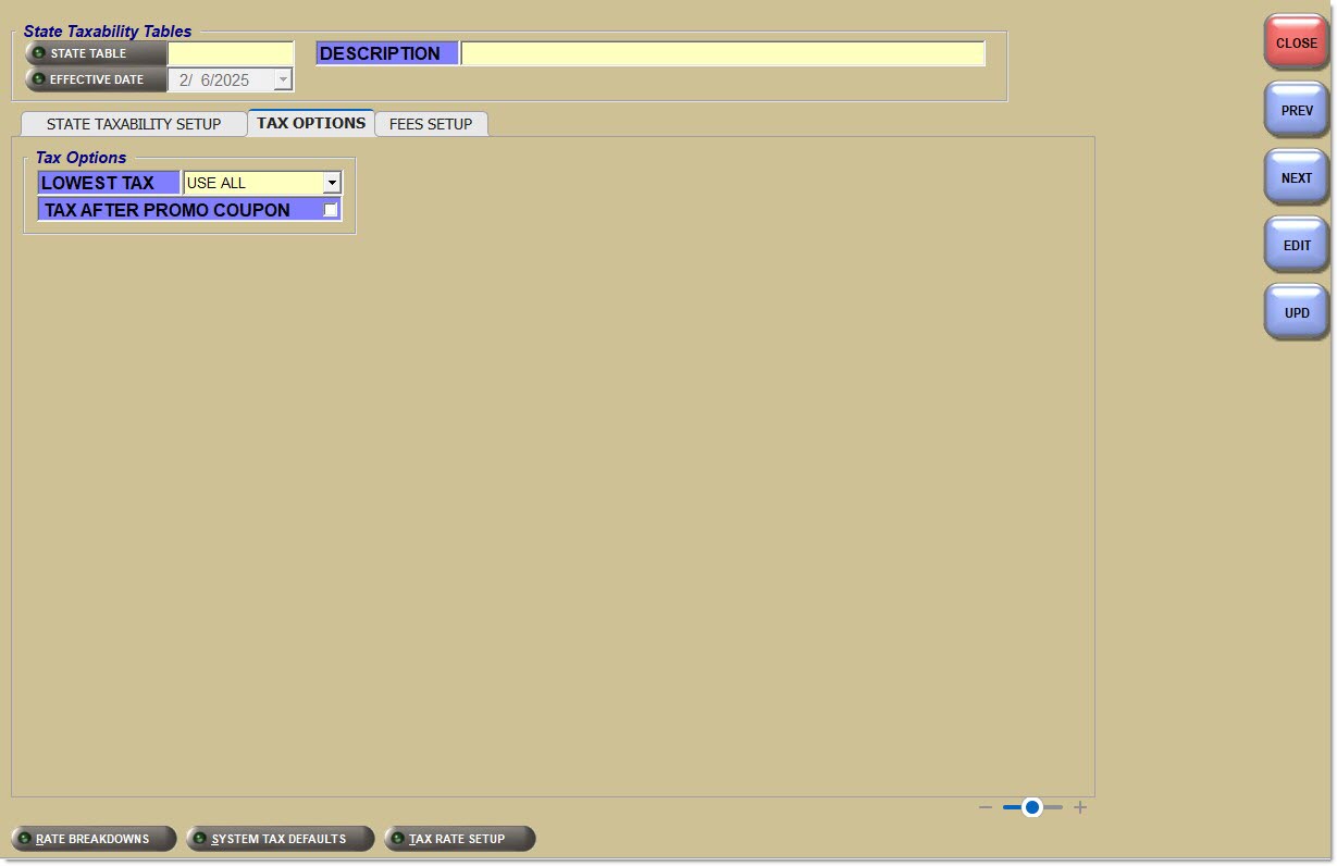 Menu Path: Controls, System, Tax Setup, State Tax Setup, State Tax Setup screen