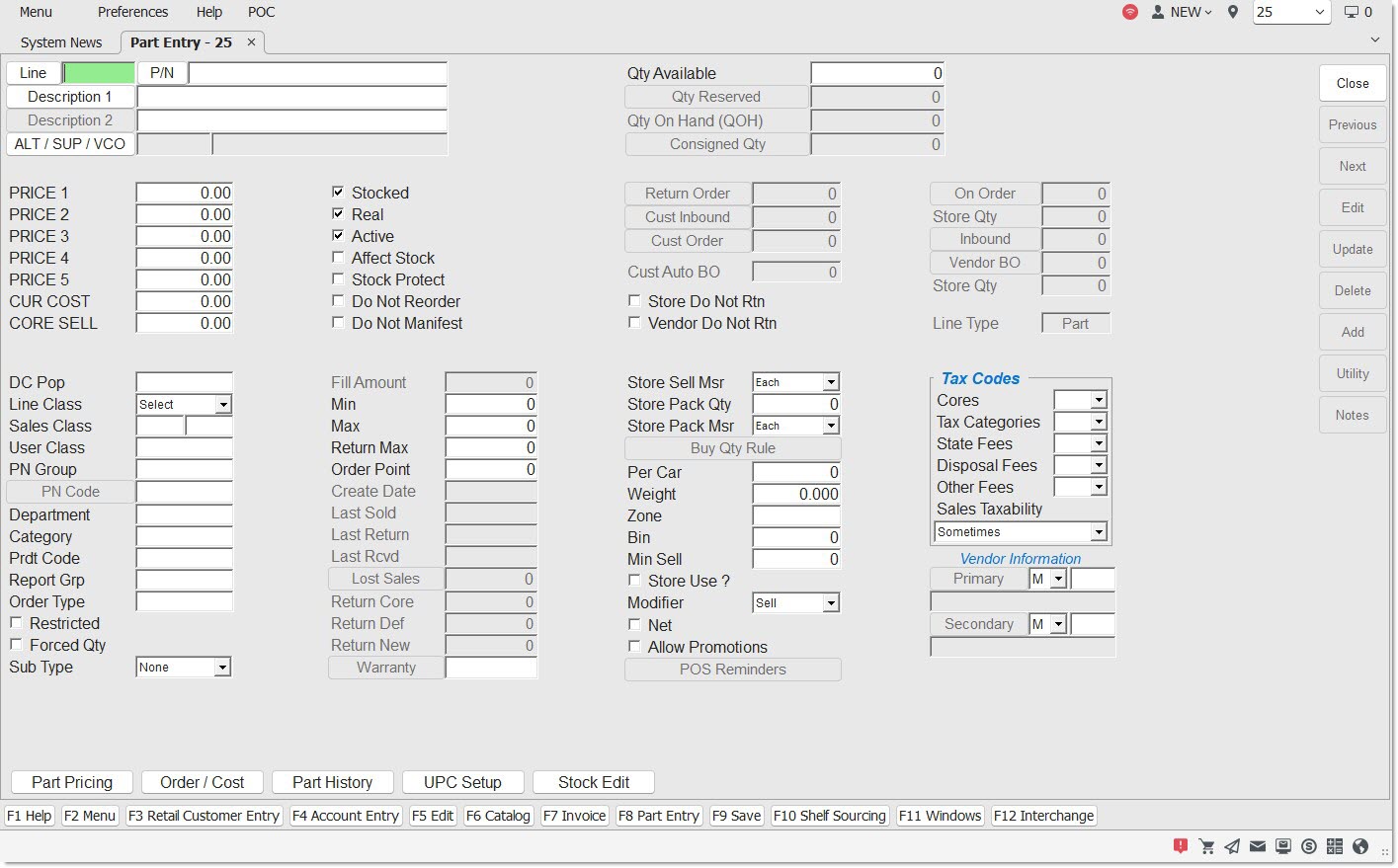 Menu Path: Inventory, Part Entry, General Info, Part Entry screen