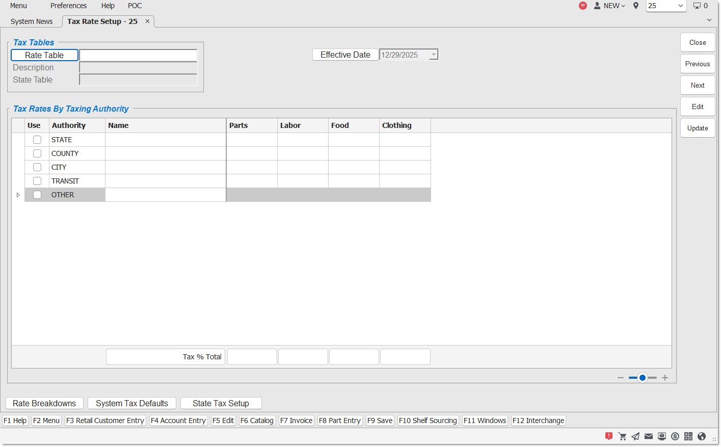 Menu Path: Controls, System, Tax Setup, Tax Rate Setup, Tax Rate Setup screen