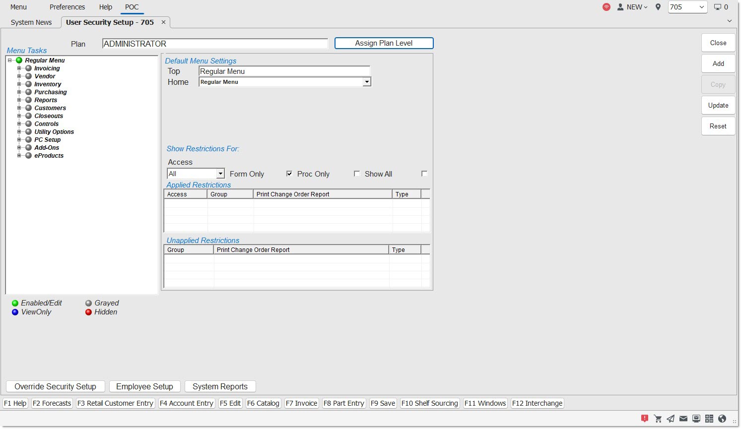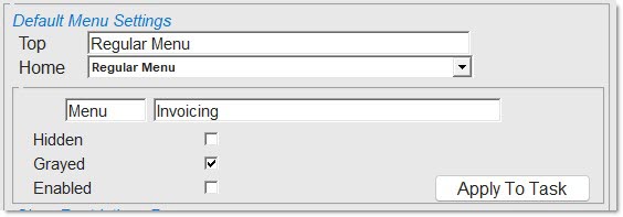 - 'GRAYED' - The menu displays but is not enabled. Therefore, the screen cannot be accessed.