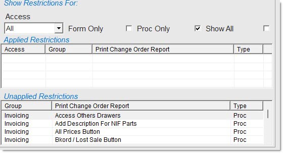 All procs that have been edited are displayed in the 'APPLIED RESTRICTIONS' grid regardless of whether they permit or deny access: